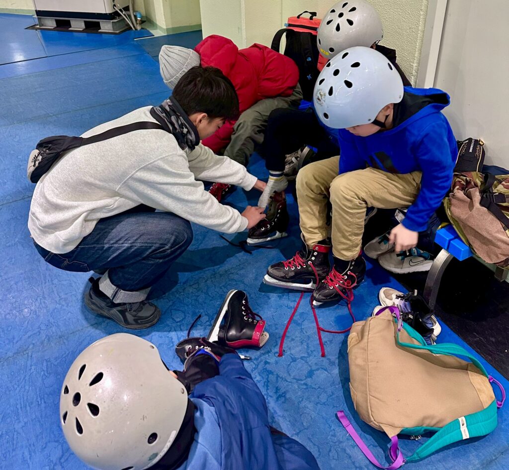 各自スケート靴とヘルメットを借りて、スケート場内のベンチへ移動。子供たちは、スタッフの助けを借りて、靴を履きます。早速皆リンクへスタート!最初はそれ程人も少なかったのですが、三連休ですのでどんどんと参加者が沢山混みあって来て、よちよち滑るくらいになってしまいました。